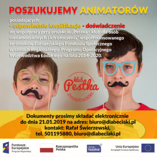 Poszukujemy Animatorów posiadających: odpowiednie kwalifikacje doświadczenie do współpracy przy projekcie „Pestka – klub dla osób niesamodzielnych i ich otoczenia” współfinansowanego ze środków Europejskiego Funduszu Społecznego w ramach Regionalnego Programu Operacyjnego Województwa Łódzkiego na lata...
