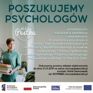Poszukujemy PSYCHOLOGÓW posiadających odpowiednie kwalifikacje oraz doświadczenie do prowadzenia spotkań indywidualnych i prowadzenia grup wsparcia niezbędnych przy realizacji projektu „Pestka – klub dla osób niesamodzielnych i ich otoczenia” współfinansowanego ze środków Europejskiego Funduszu Społecznego w ramach Regionalnego...