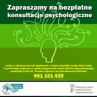 Zapraszamy na bezpłatne konsultacje psychologiczne osoby z cukrzycą oraz ich opiekunów, a także wszystkie osoby które czują że potrzebują wsparcia w wyniku pogorszenia stanu zdrowia spowodowanego pandemią Covid 19′. Prosimy zgłaszać się pod numerem...