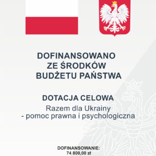 Pomoc prawna i psychologiczna W ramach realizacji projektu finansowanego przez Kancelarię Prezesa Rady Ministrów zapraszamy na psychologiczne warsztaty oraz szkolenia z zakresu podstawowych zasad prawa polskiego dla obywateli Ukrainy. Warsztaty i szkolenia odbywają się...