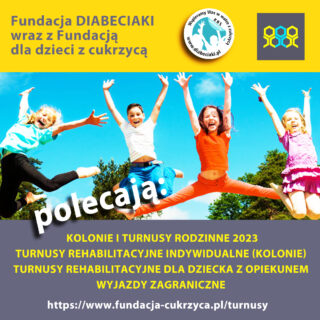 Fundacja DIABECIAKI wraz z Fundacją dla dzieci z cukrzycą polecają: KOLONIE I TURNUSY RODZINNE 2023TURNUSY REHABILITACYJNE INDYWIDUALNE (KOLONIE)TURNUSY REHABILITACYJNE DLA DZIECKA Z OPIEKUNEMWYJAZDY ZAGRANICZNE szczegóły: //www.fundacja-cukrzyca.pl/turnusy?fbclid=IwAR3pFxiKGSET5nhqzcinCj1_gTkDAKBFP6sRBTbykf5NP52HYwCzE2xxOig