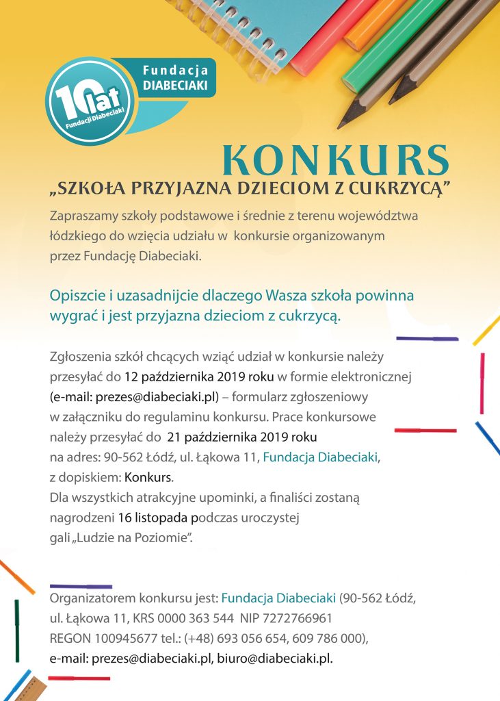Konkurs – Szkoła Przyjazna Dzieciom z Cukrzycą przez Tomasz · Opublikowano 25 września 2019 · Zaktualizowano 2 października 2019 Regulamin konkursuPobierz