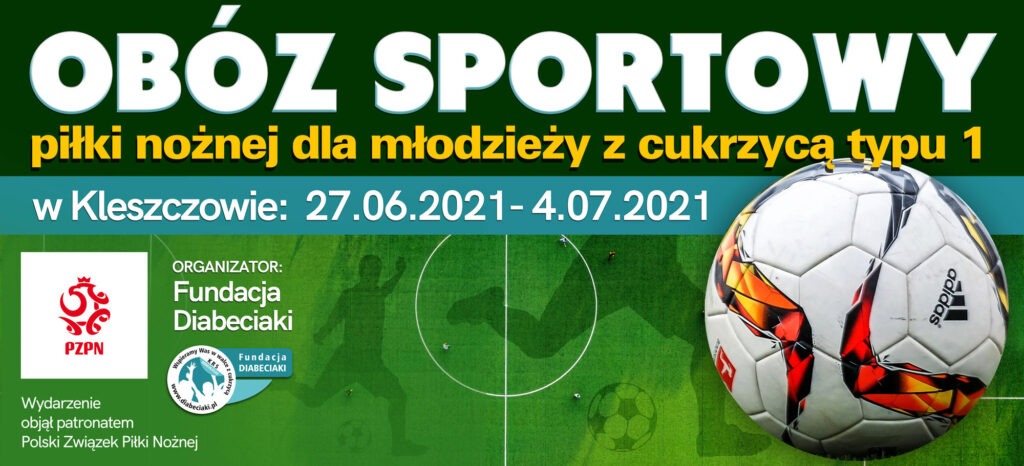 Po raz trzeci mamy przyjemność w zaprosić grupę młodych zawodników z cukrzycą typu 1 na obóz sportowy piłki nożnej, który odbędzie się w Kleszczowie, w dniach od 27.06.2021 do 4.07.2021. Mamy nadzieję, że sytuacja epidemiologiczna pozwoli na zorganizowanie wydarzenia i stopniowy powrót do normalnego życia oraz dawnej aktywności sportowej. Na obóz zapraszamy chłopców w wieku 14-15 lat (roczniki 2006 i 2007), uprawiających piłkę nożną przynajmniej 2 razy w tygodniu w klubach sportowych. Pierwszeństwo mają zawodnicy grający w klubach zarejestrowanych w Wojewódzkich Związkach Piłki Nożnej.