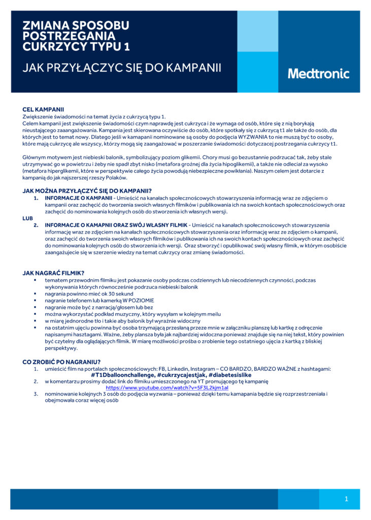 nieustającego zaangażowania. Kampania jest skierowana oczywiście do osób, które spotkały się z cukrzycą t1 ale także do osób, dla których jest to temat nowy. Dlatego jeśli w kampanii nominowane są osoby do podjęcia WYZWANIA to nie muszą być to osoby, które mają cukrzycę ale wszyscy, którzy mogą się zaangażować w poszerzanie świadomości dotyczącej postrzegania cukrzycy t1.