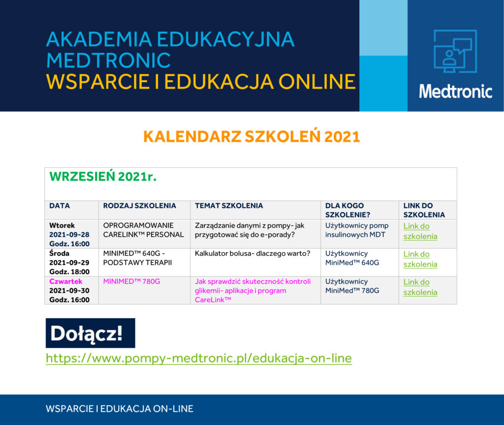 Naszym celem jest zapewnienie kontynuacji spotkań edukacyjnych poprzez przekazywanie wiedzy oraz ćwiczenie umiejętności praktycznych z zakresu terapii cukrzycy przy stosowaniu zintegrowanych systemów Medtronic: MiniMed™ 640G, MiniMed™ VEO™ oraz systemu ciągłego monitorowania glikemii Guardian™ Connect a także oprogramowania on-line wspomagającego leczenie – CareLink™ Personal.