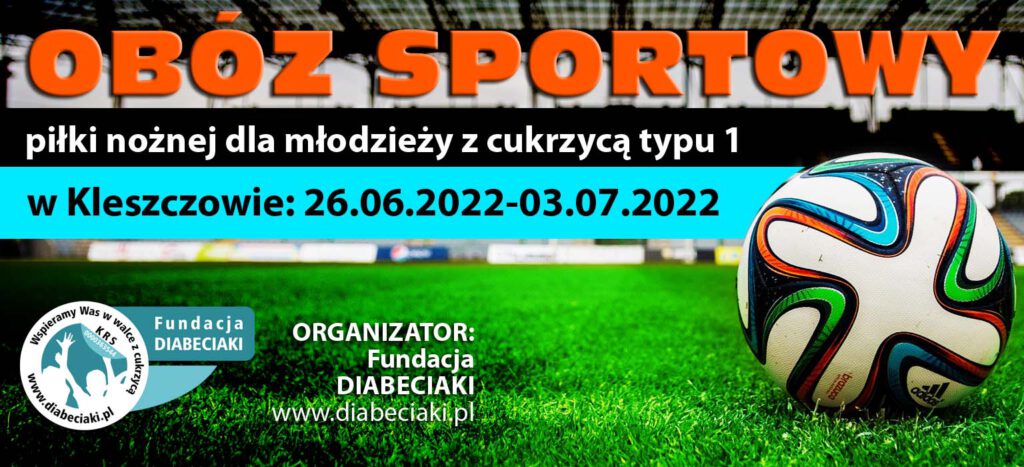 Po raz czwarty mamy przyjemność zaprosić grupę młodych zawodników z cukrzycą typu 1 na obóz sportowy piłki nożnej, który odbędzie się w Kleszczowie, w dniach od 26.06.2022- 03.07.2022. Zapraszamy chłopców w wieku 13-16 lat (roczniki 2006-2009), uprawiających piłkę nożną przynajmniej 2 razy w tygodniu w klubach sportowych.