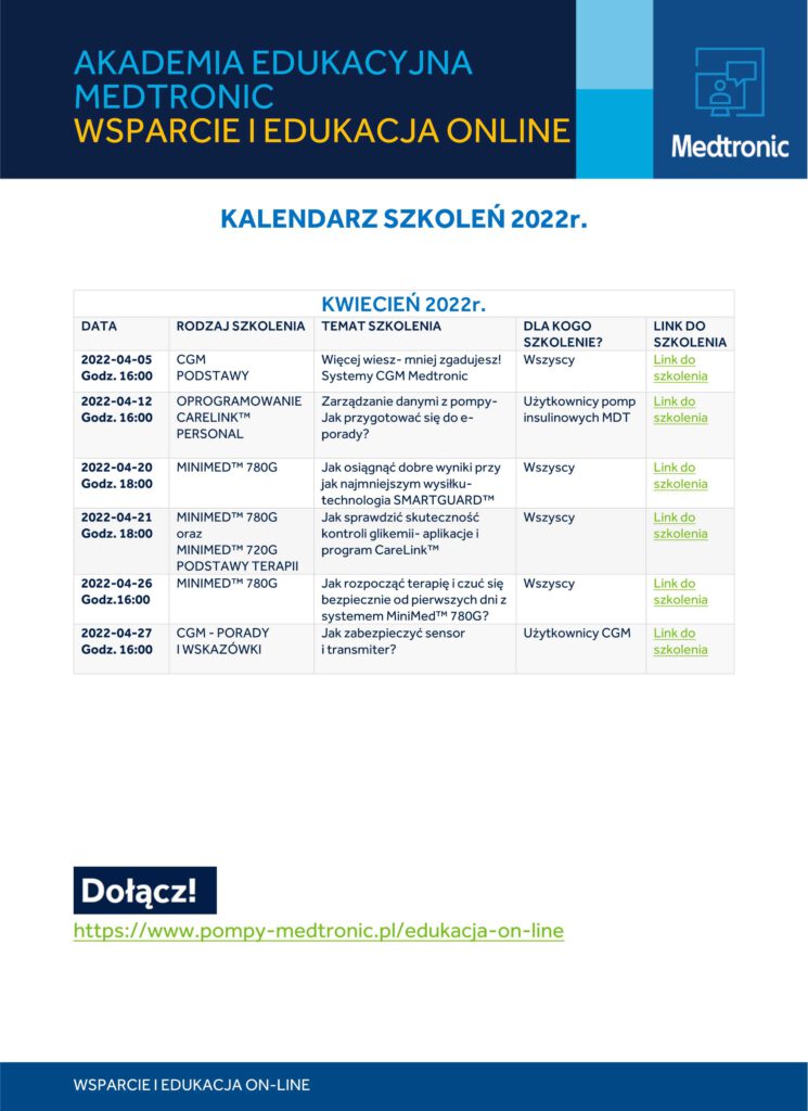 załączam _Kalendarz Szkoleń_ na kwieci eń 2022r, dla pacjentów leczonych przy pomocy osobistej pompy insulinowej firmy Medtronic, ponownie prosząc o: