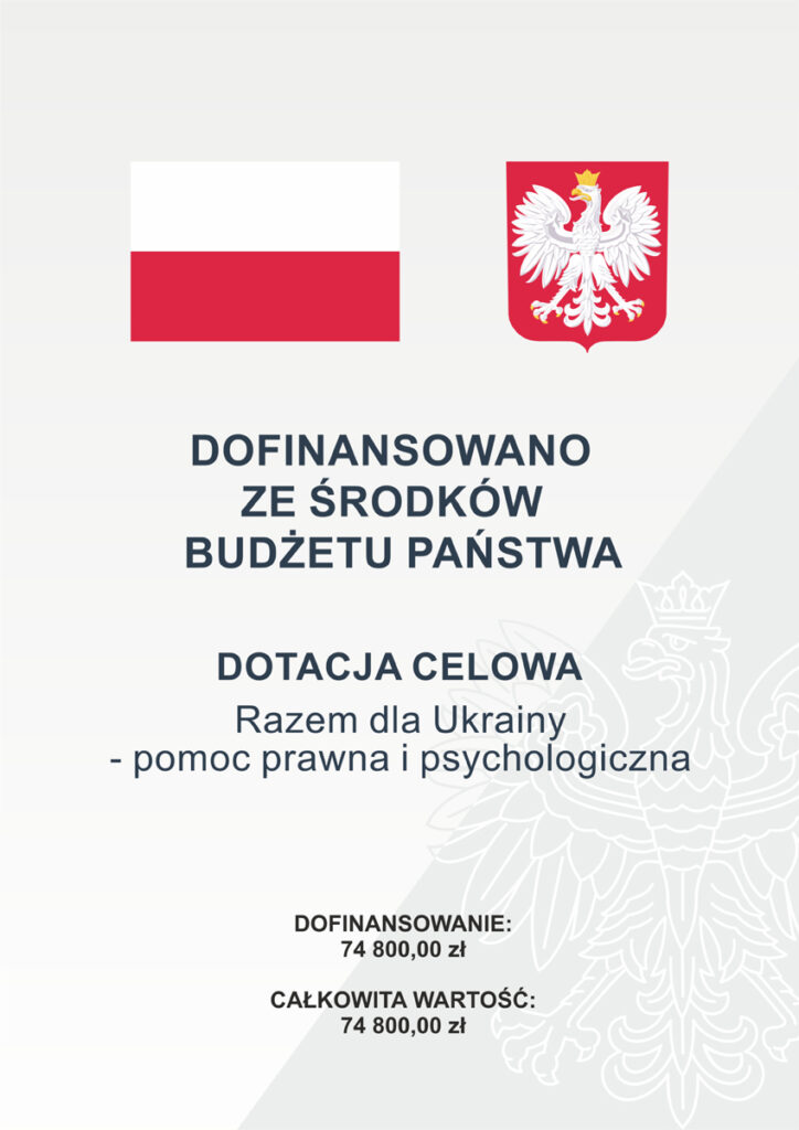 W ramach realizacji projektu finansowanego przez Kancelarię Prezesa Rady Ministrów zapraszamy na psychologiczne warsztaty oraz szkolenia z zakresu podstawowych zasad prawa polskiego dla obywateli Ukrainy. Warsztaty i szkolenia odbywają się w miejscach pobytu obywateli Ukrainy. W ramach realizacji projektu psychoterapeuci oraz prawnik udzielają również konsultacji indywidualnych.