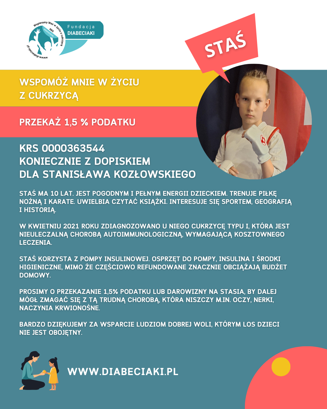 W kwietniu 2021 roku zdiagnozowano u niego cukrzycę typu I, która jest nieuleczalną chorobą autoimmunologiczną, wymagającą kosztownego leczenia. Staś korzysta z pompy insulinowej. Osprzęt do pompy, insulina i środki higieniczne, mimo że częściowo refundowane znacznie obciążają budżet domowy.