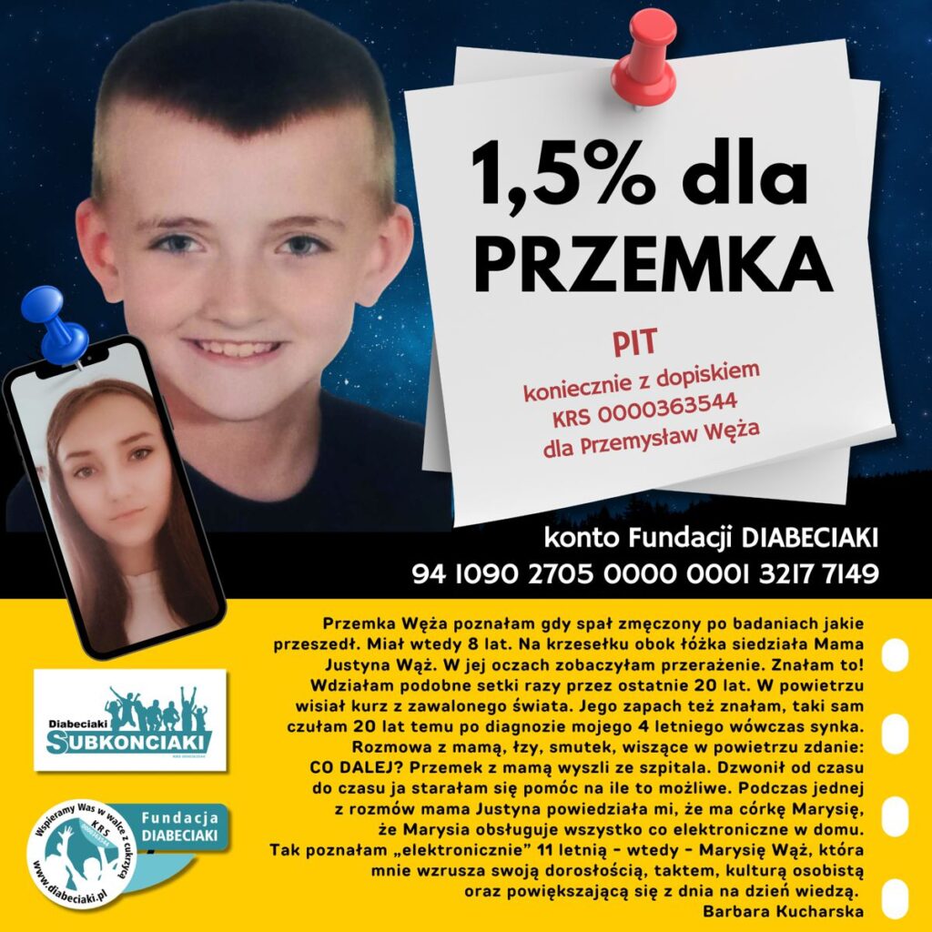 Proszę Was o 1,5 % swoich wirtualnych pieniędzy dla Przemka Węża, chorego na cukrzycę typu 1, bo to bardzo droga choroba mimo wszelakich refundacji i pozornych udogodnień.
