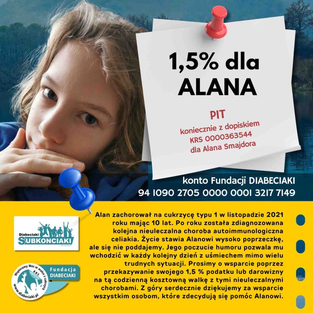 Alan zachorował na cukrzycę typu 1 w listopadzie 2021 roku mając 10 lat. Po roku została zdiagnozowana kolejna nieuleczalna choroba autoimmunologiczna celiakia. Życie stawia Alanowi wysoko poprzeczkę, ale się nie poddajemy. Jego poczucie humoru pozwala mu wchodzić w każdy kolejny dzień z uśmiechem mimo wielu sytuacji, które wyciskają łzy. Jego życie nie jest tak beztroskie jak innych rówieśników. Musiał dorosnąć szybciej niż inni aby radzić sobie z chorobą. Niestety nie będzie mógł też w przyszłości spełnić swoich wszystkich marzeń np. zostać pilotem 🙁