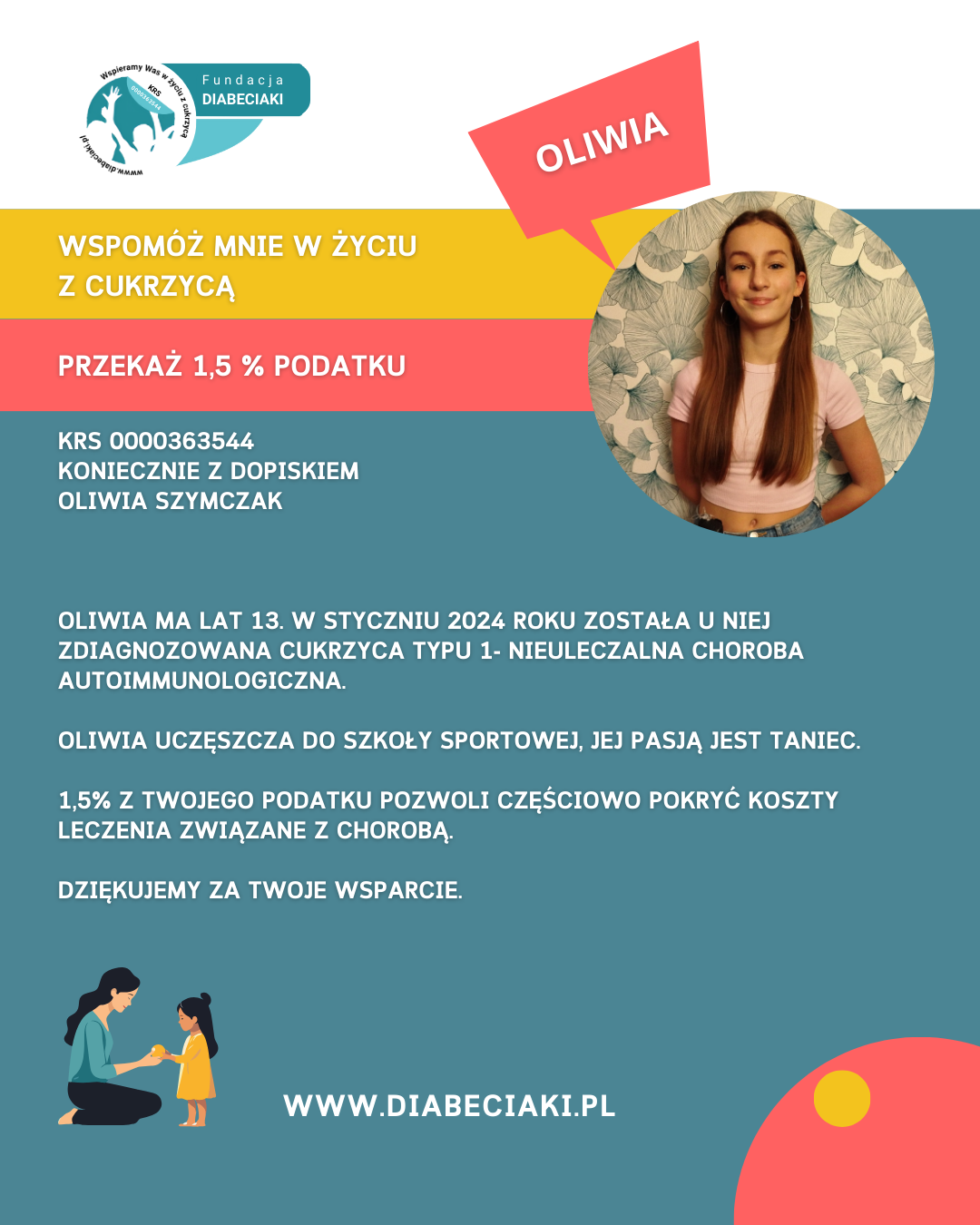 Oliwia ma lat 13. W styczniu 2024 roku została u niej zdiagnozowana cukrzyca typu 1- nieuleczalna choroba autoimmunologiczna. Oliwia uczęszcza do szkoły sportowej, jej pasją jest taniec.
