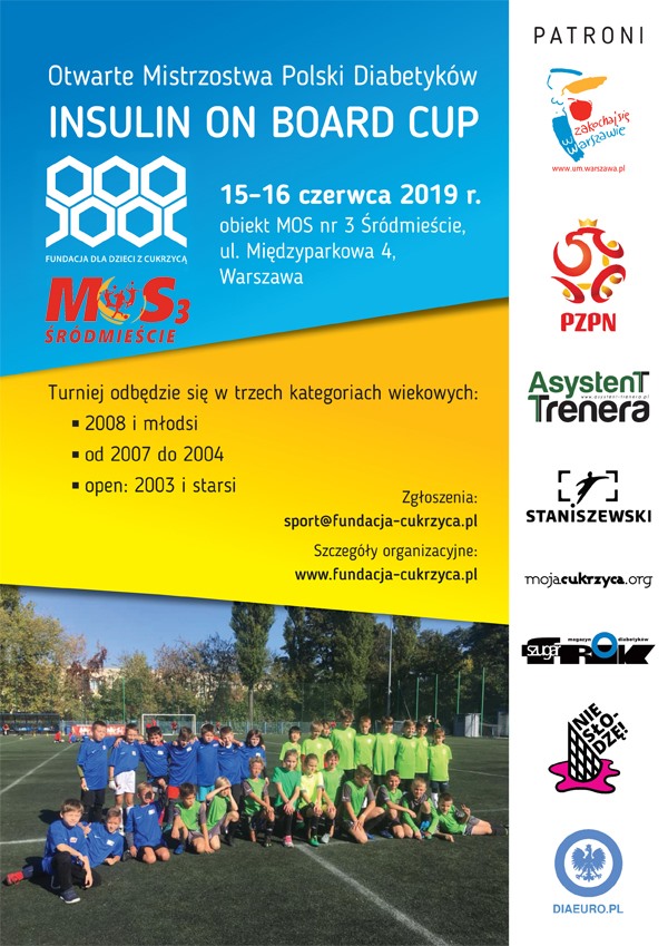 Już w najbliższy weekend (15-16 czerwca) wraz z MOS 3 Śródmieście i ACTIVEdiabet – Michał Jeliński zapraszamy na turniej piłkarski w randze Mistrzostw Polski „INSULIN ON BOARD CUP”. Patronat nad wydarzeniem objął Prezydent Miasta Warszawy oraz Polski Związek Piłki Nożnej.