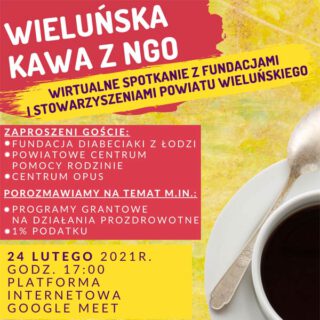 Szanowni Państwo, Czas na kawę! Kawę dla stowarzyszeń i fundacji z powiatu wieluńskiego. Tematem najbliższego spotkania będą tematy prozdrowotne, na które zapraszamy wszystkie organizacje pozarządowe oraz samorządowców. Gościem specjalnym będzie prezes łódzkiej Fundacji Diabeciaki,...