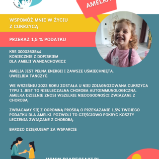 Amelia jest pełna energii i zawsze uśmiechnięta. Uwielbia tańczyć. We wrześniu 2023 roku została u niej zdiagnozowana cukrzyca typu 1. Jest to nieuleczalna choroba autoimmunologiczna. Amelka dzielnie znosiwszelkie niedogodności związane z chorobą. Zwracamy się...