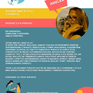 Jestem Amelka i mam 16 lat. W nowy rok szkolny 2021/2022, zamiast plecaka wypełnionego pięknymi wspomnieniami z wakacji, wkroczyłam z pompą insulinową, glukometrem, sensorem i glukozą. Od tamtych pamiętnych wakacji do końca życia, towarzyszyć...
