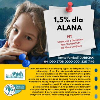 Alan zachorował na cukrzycę typu 1 w listopadzie 2021 roku mając 10 lat. Po roku została zdiagnozowana kolejna nieuleczalna choroba autoimmunologiczna celiakia. Życie stawia Alanowi wysoko poprzeczkę, ale się nie poddajemy. Jego poczucie humoru...