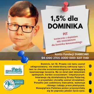 Dominik, lat 13. Prawie rok temu został zdiagnozowany, ma stwierdzoną cukrzycę typu I. Jest to choroba autoimmunologiczna, wymagającą kosztownego leczenia . Na co dzień jest dzieckiem spokojnym, bardzo uczuciowym i empatycznym. Interesuje się działalnością...